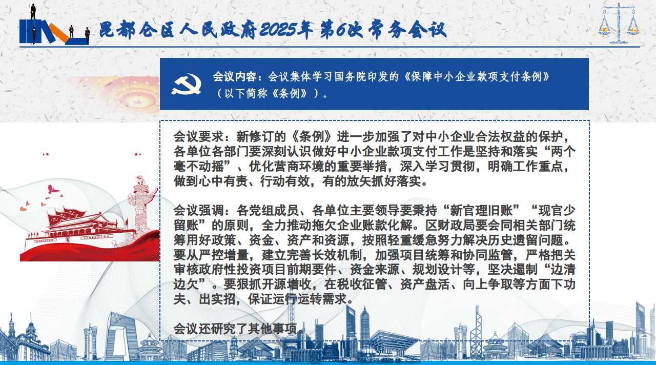 會議集體學(xué)習(xí)國務(wù)院印發(fā)的《保障中小企業(yè)款項支付條例》(以下簡稱《條例》)。