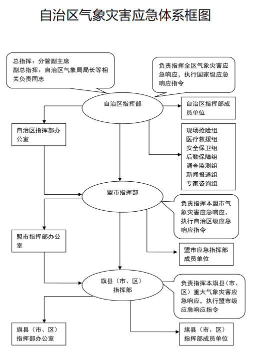 自治區(qū)人民政府成立自治區(qū)人工影響天氣與氣象災害防御指揮部(以下簡稱“自治區(qū)指揮部”),統(tǒng)一領(lǐng)導和指揮氣象災害監(jiān)測、預報預警、分析研判和應急處置工作??傊笓]由自治區(qū)政府分管副主席擔任,內(nèi)蒙古氣象局局長等相關(guān)負責同志擔任副總指揮。