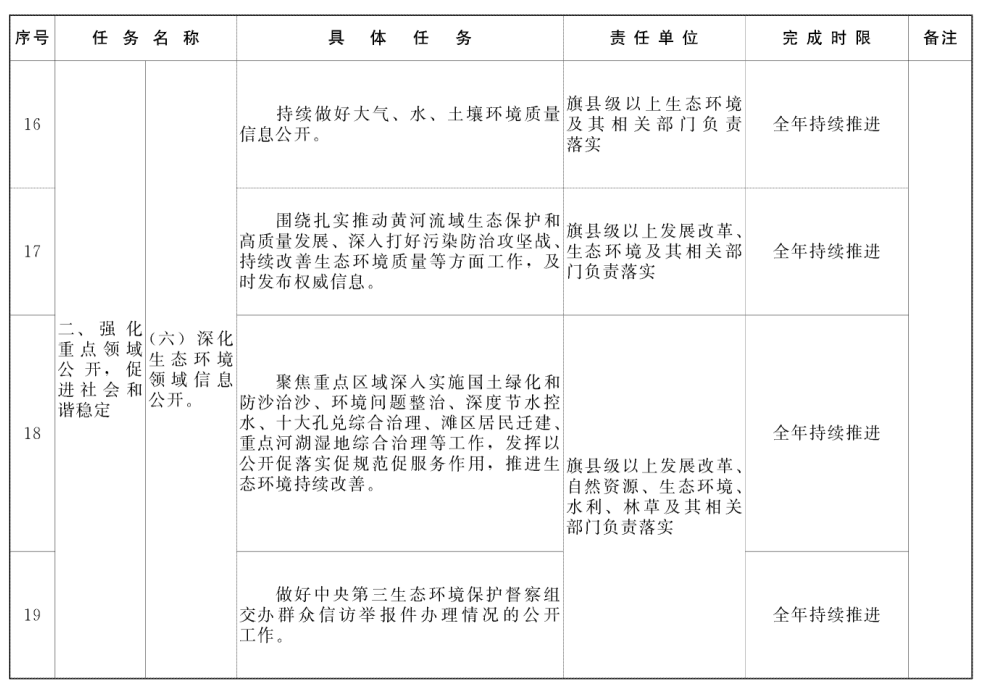 (六)深化生態(tài)環(huán)境領(lǐng)域信息公開。持續(xù)做好大氣、水、土壤環(huán)境質(zhì)量信息公開。圍繞扎實(shí)推動(dòng)黃河流域生態(tài)保護(hù)和高質(zhì)量發(fā)展、深入打好污染防治攻堅(jiān)戰(zhàn)、持續(xù)改善生態(tài)環(huán)境質(zhì)量等方面工作,及時(shí)發(fā)布權(quán)威信息。聚焦重點(diǎn)區(qū)域深入實(shí)施國土綠化和防沙治沙、環(huán)境問題整治、深度節(jié)水控水、十大孔兌綜合治理、灘區(qū)居民遷建、重點(diǎn)河湖濕地綜合治理等工作,發(fā)揮以公開促落實(shí)促規(guī)范促服務(wù)作用,推進(jìn)生態(tài)環(huán)境持續(xù)改善。做好中央第三生態(tài)環(huán)境保護(hù)督察組交辦群眾信訪舉報(bào)案件辦理情況的公開工作。