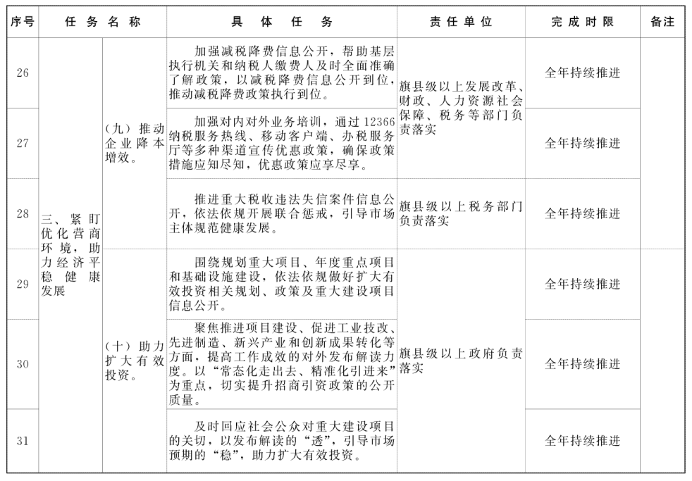 (九)推動(dòng)企業(yè)降本增效。加強(qiáng)減稅降費(fèi)信息公開,幫助基層執(zhí)行機(jī)關(guān)和納稅人繳費(fèi)人及時(shí)全面準(zhǔn)確了解政策,以減稅降費(fèi)信息公開到位,推動(dòng)減稅降費(fèi)政策執(zhí)行到位。加強(qiáng)對(duì)內(nèi)對(duì)外業(yè)務(wù)培訓(xùn),通過12366納稅服務(wù)熱線、移動(dòng)客戶端、政務(wù)服務(wù)場(chǎng)所等多種渠道宣傳優(yōu)惠政策,確保政策措施應(yīng)知盡知、優(yōu)惠政策應(yīng)享盡享。推進(jìn)重大稅收違法失信案件信息公開,依法依規(guī)開展聯(lián)合懲戒,引導(dǎo)市場(chǎng)主體規(guī)范健康發(fā)展。